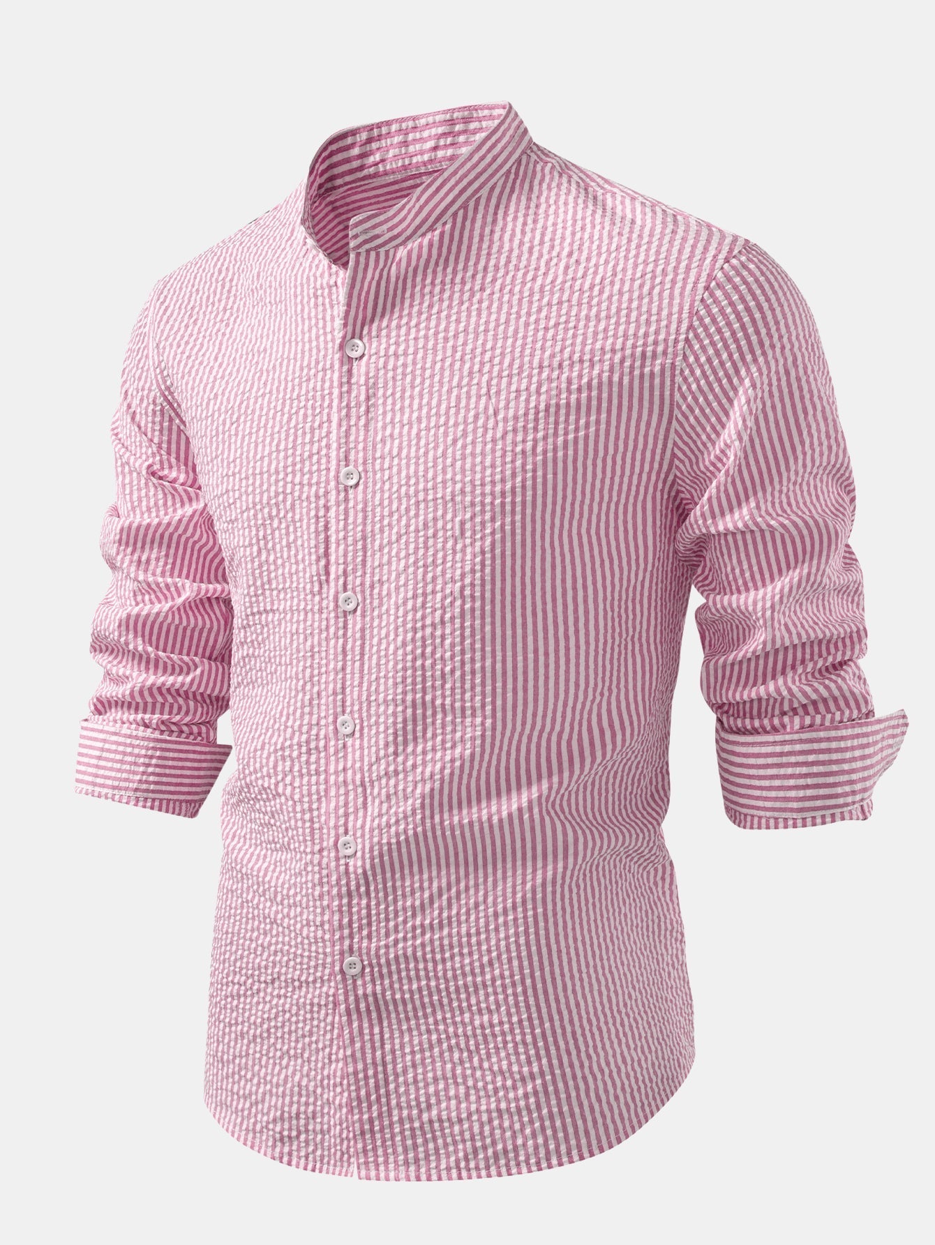 Elevate your everyday style with the clean and modern look of the striped high-collar button-up shirt. Featuring a minimalist high collar and a vertical stripe design, this shirt combines a classic fit with a contemporary touch. Perfect for workdays, weekend outings, or layering under a jacket for a polished look.